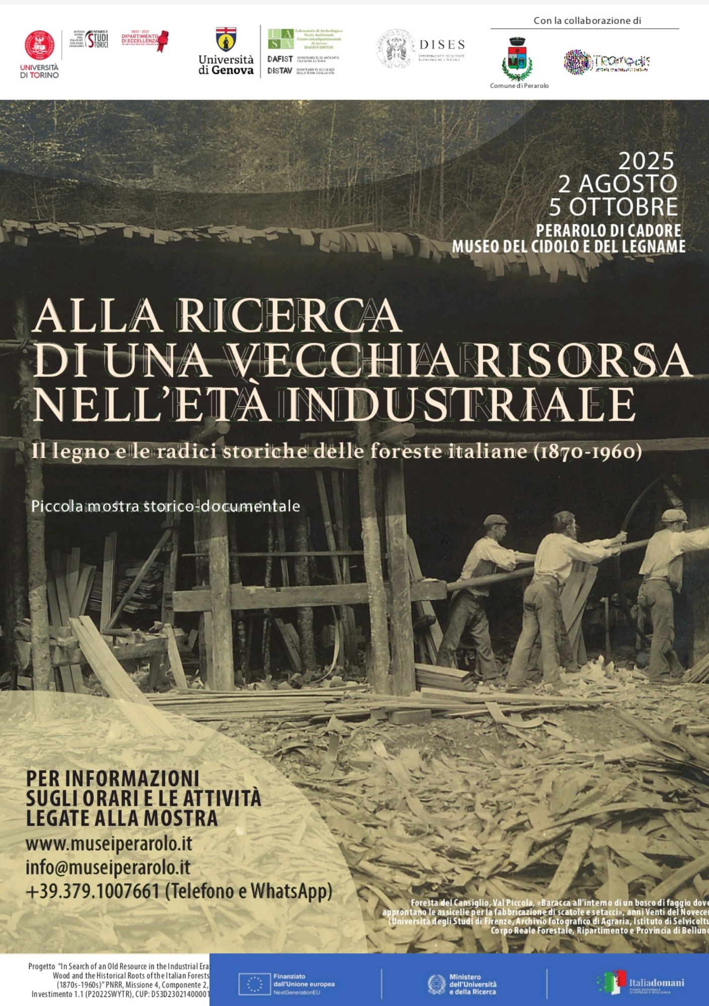 La mostra è intitolata Alla ricerca di una vecchia risorsa nell’età industriale. Il legno e le radici storiche delle foreste italiane (1870-1960) ed è stata realizzata nell’ambito di un progetto Prin-Pnrr dal titolo “In Search of an Old Resource in the Industrial Era: Wood and the Historical Roots of the Italian Forests (1870s-1960s)” che ha coinvolto docenti delle università di Torino, Genova e Politecnica delle Marche. Con questo progetto, il cui obiettivo era quello di studiare i mutamenti intercorsi nella lunga fase di passaggio dall’economia pre-industriale a industriale delle foreste italiane, il caso di Perarolo è stato cruciale.